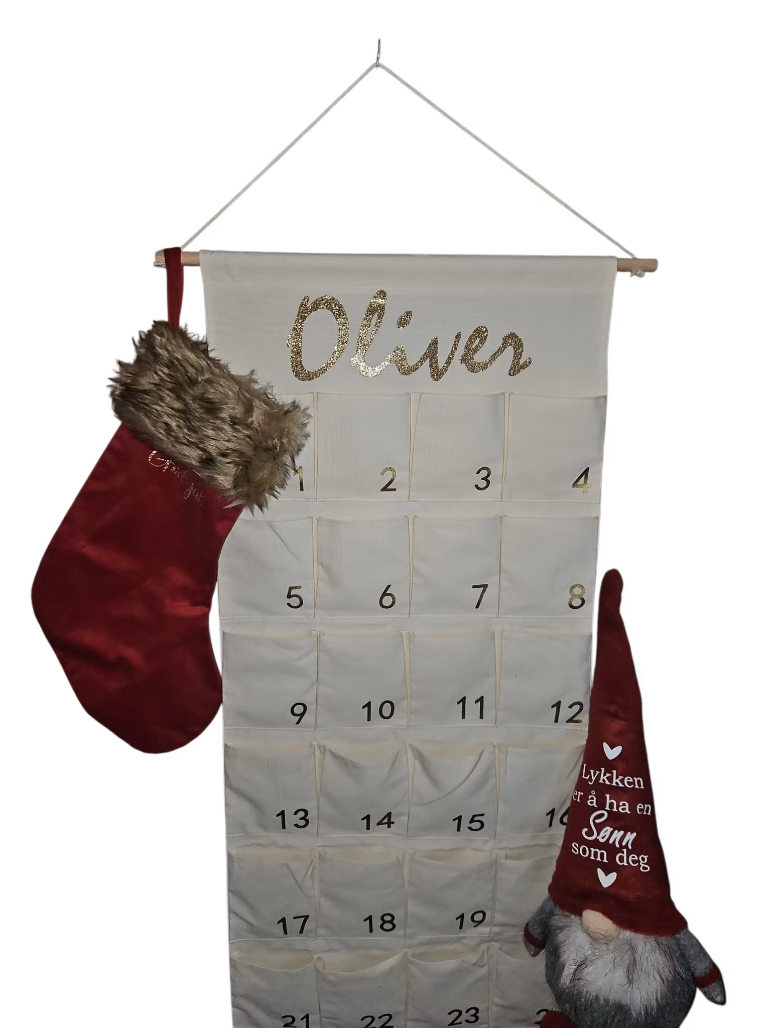 Gjør nedtellingen til jul ekstra spesiell med vår personlige adventskalender! Denne flotte kalenderen kan tilpasses med et navn, noe som gjør den til en unik og gjennomtenkt gave. Den vil bli trykket i gull glitter farge. Perfekt for både barn og voksne som elsker julen.