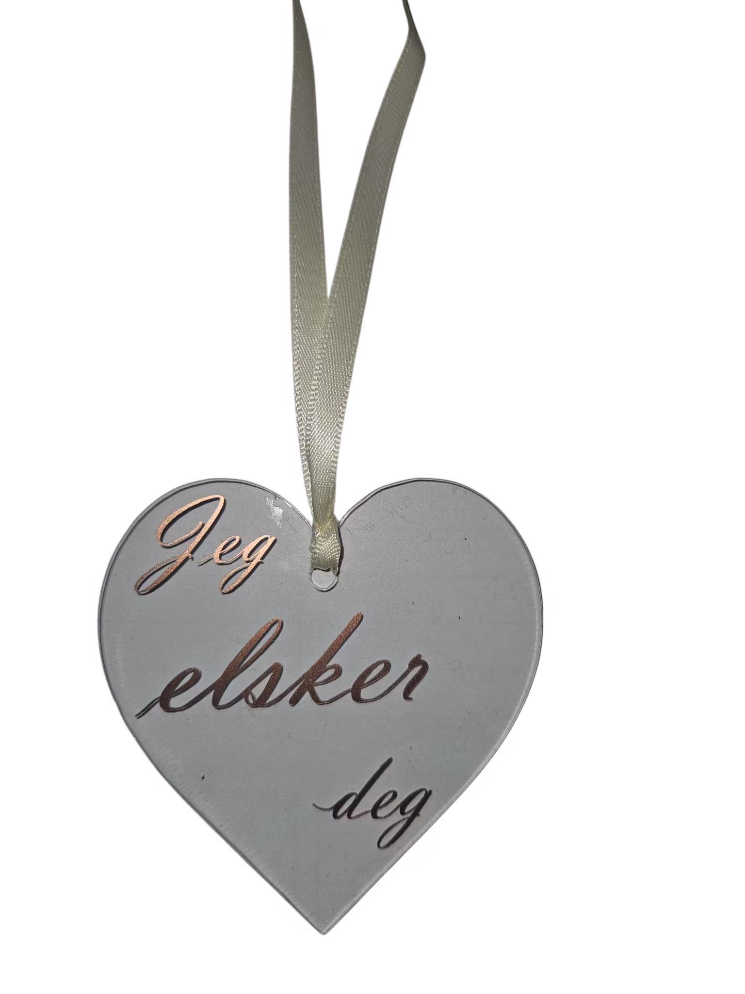 Disse julekulene er formet som hjerte og laget av pleksiglass. Du kan velge farge og navn eller liten tekst, skrevet på med en farge som har en glitrende effekt. En morsom og personlig pynt til juletreet!