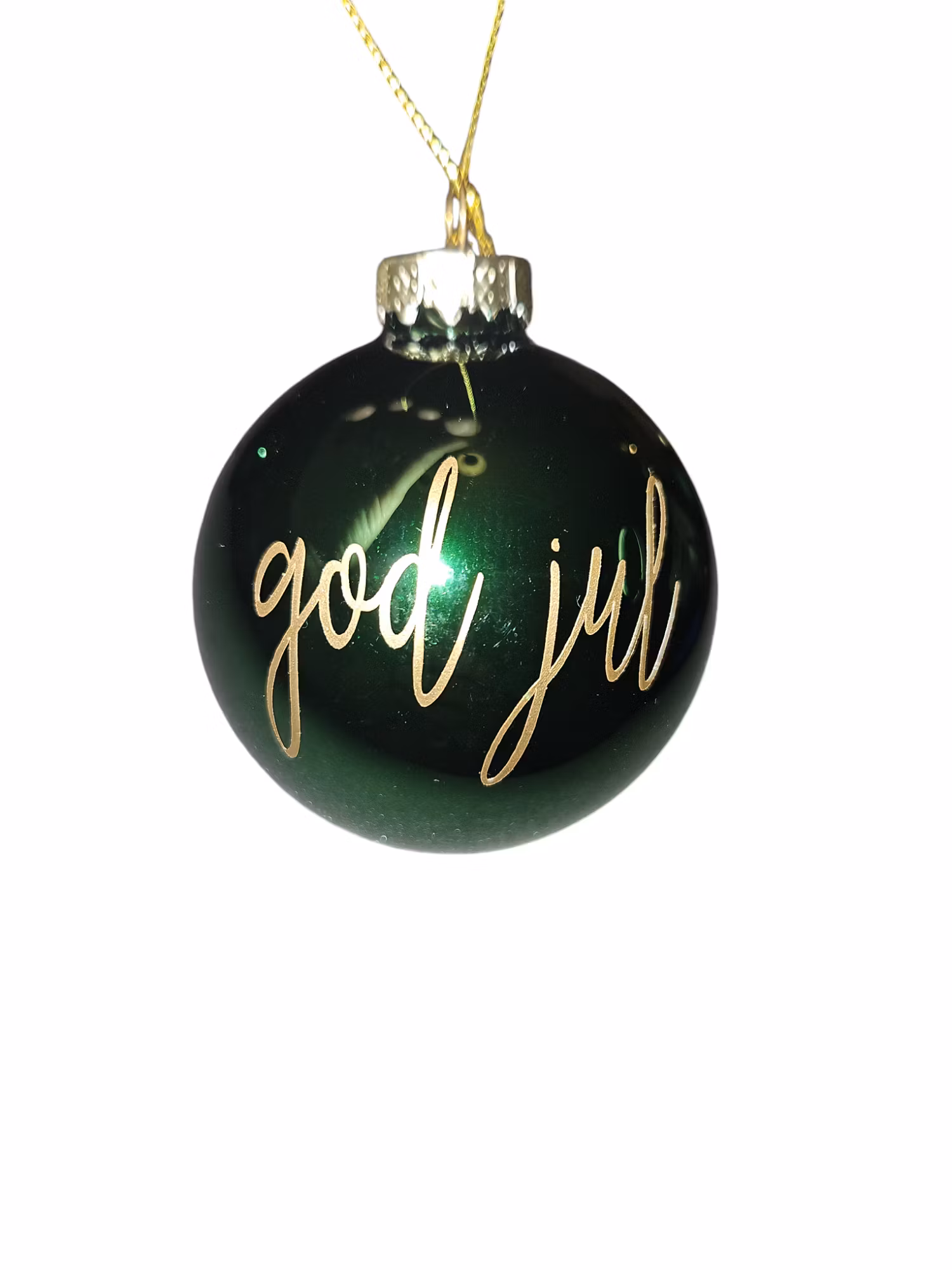 Her kan du velge navn, skrifttype og mellom matt, glitter eller blank gullfarge på skriften på julekulen. Julekulene som vist på bilde har skrifttype nr. 7.