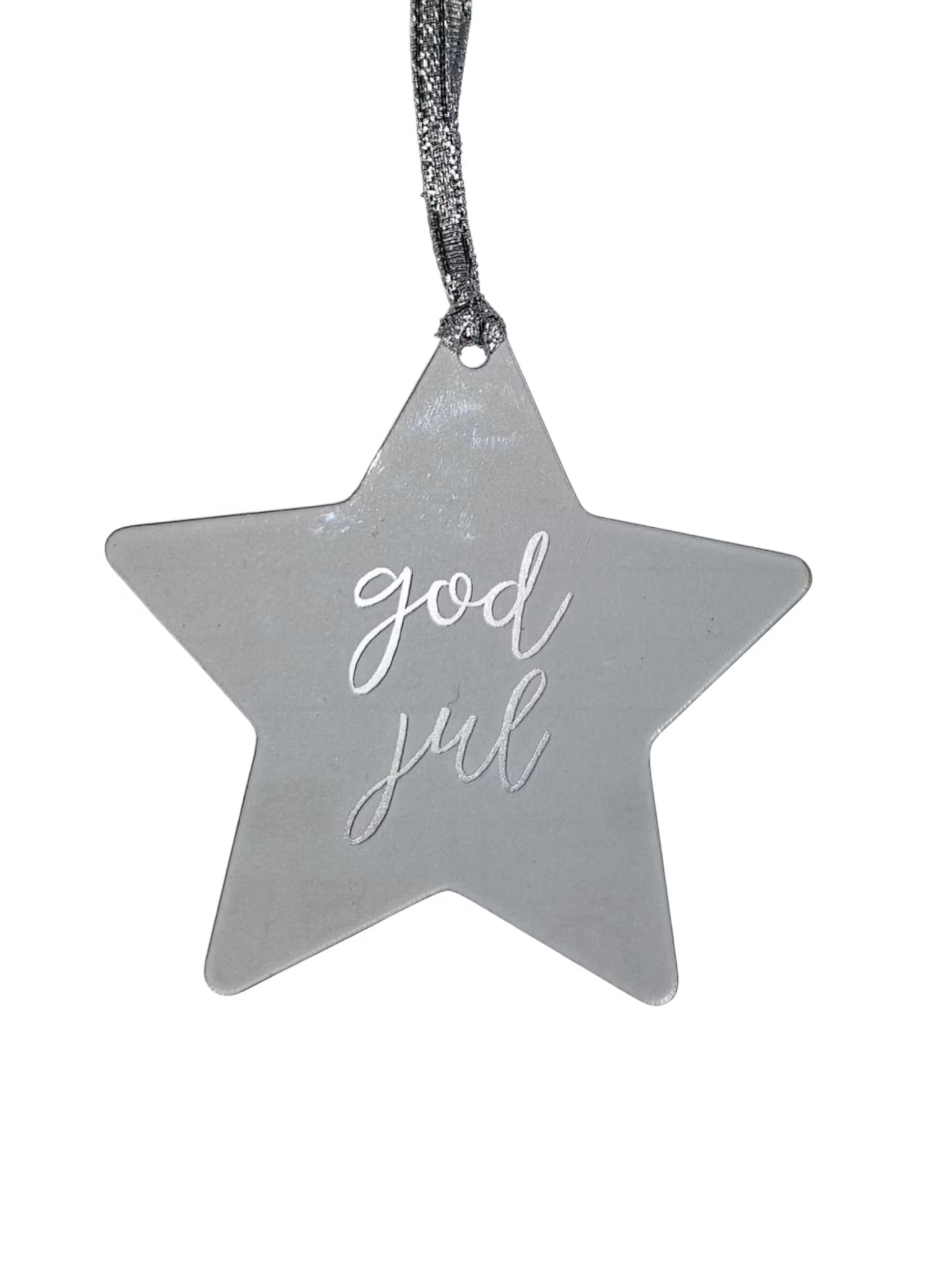Disse julekulene er formet som en stjerne og laget av pleksiglass. Du kan velge farge og navn eller liten tekst, skrevet på med en farge som har en glitrende effekt. En morsom og personlig pynt til juletreet!