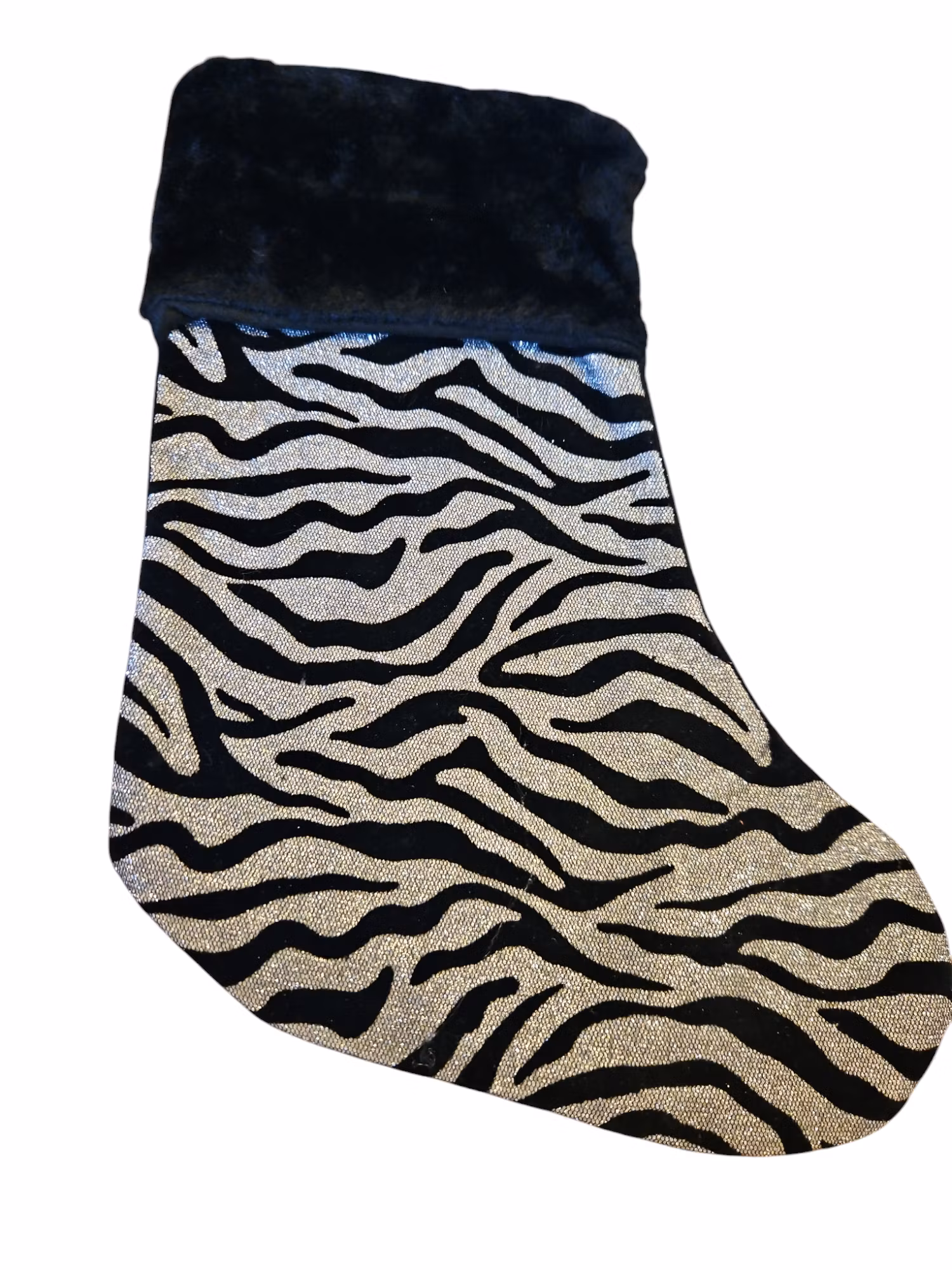 Stilfull julestrømpe med zebramønster og sort kant. Her har du muligheten til å personalisere med navn og skrifttype.
