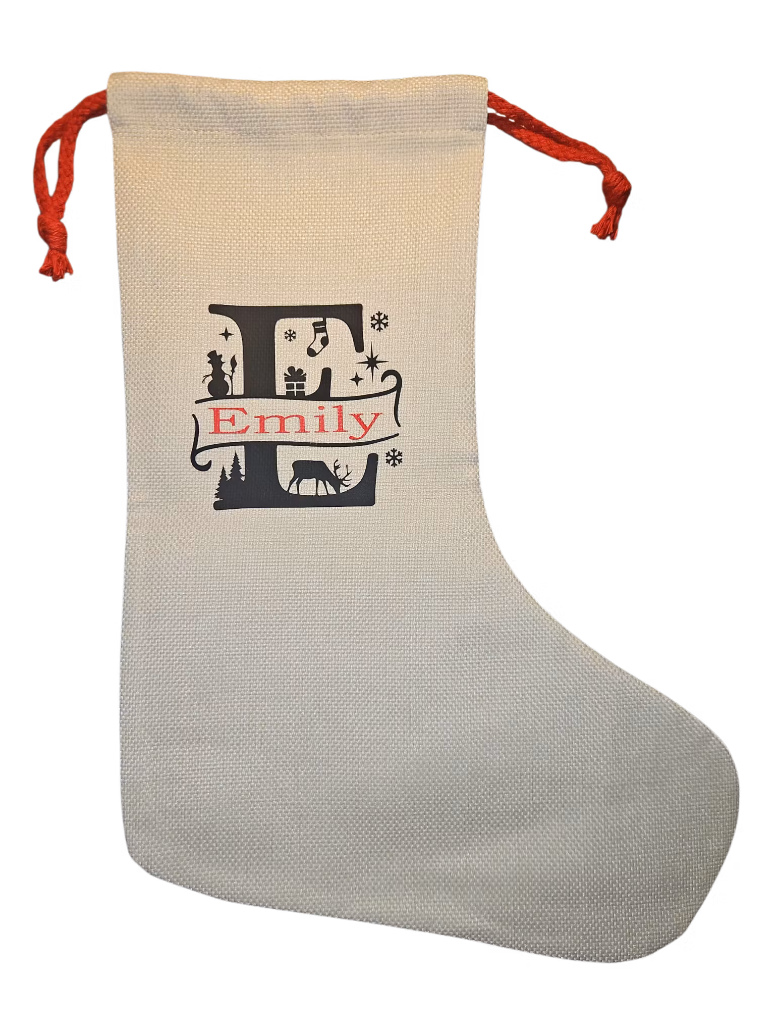 Gi julestemningen et personlig preg med denne personlige julestrømpen! Velg navnet du ønsker (kun engelsk alfabet), og vi trykker det i rødt sammen med en stilig sort forbokstav fylt med julemotiver. Perfekt for å fylle med små gaver og overraskelser. Med en fin rød snor, er den klar til å henge over peisen, på døren eller ved sengen.