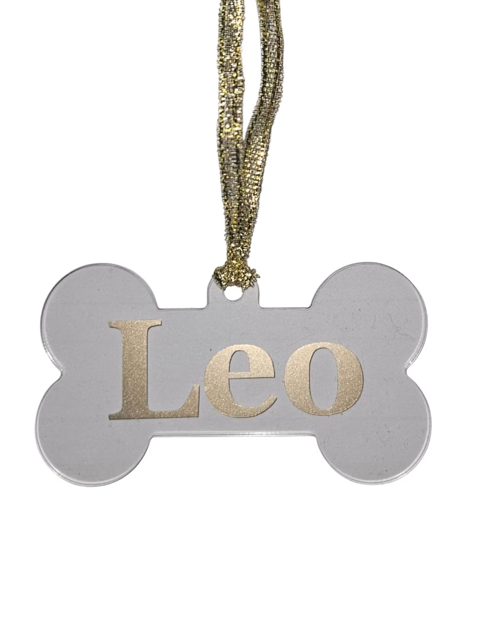 Disse julekulene er formet som hundebein og laget av pleksiglass. Du kan velge størrelse, farge og få navnet til hunden din (eller noen andre) skrevet på med en farge som har en glitrende effekt. En morsom og personlig pynt til juletreet!