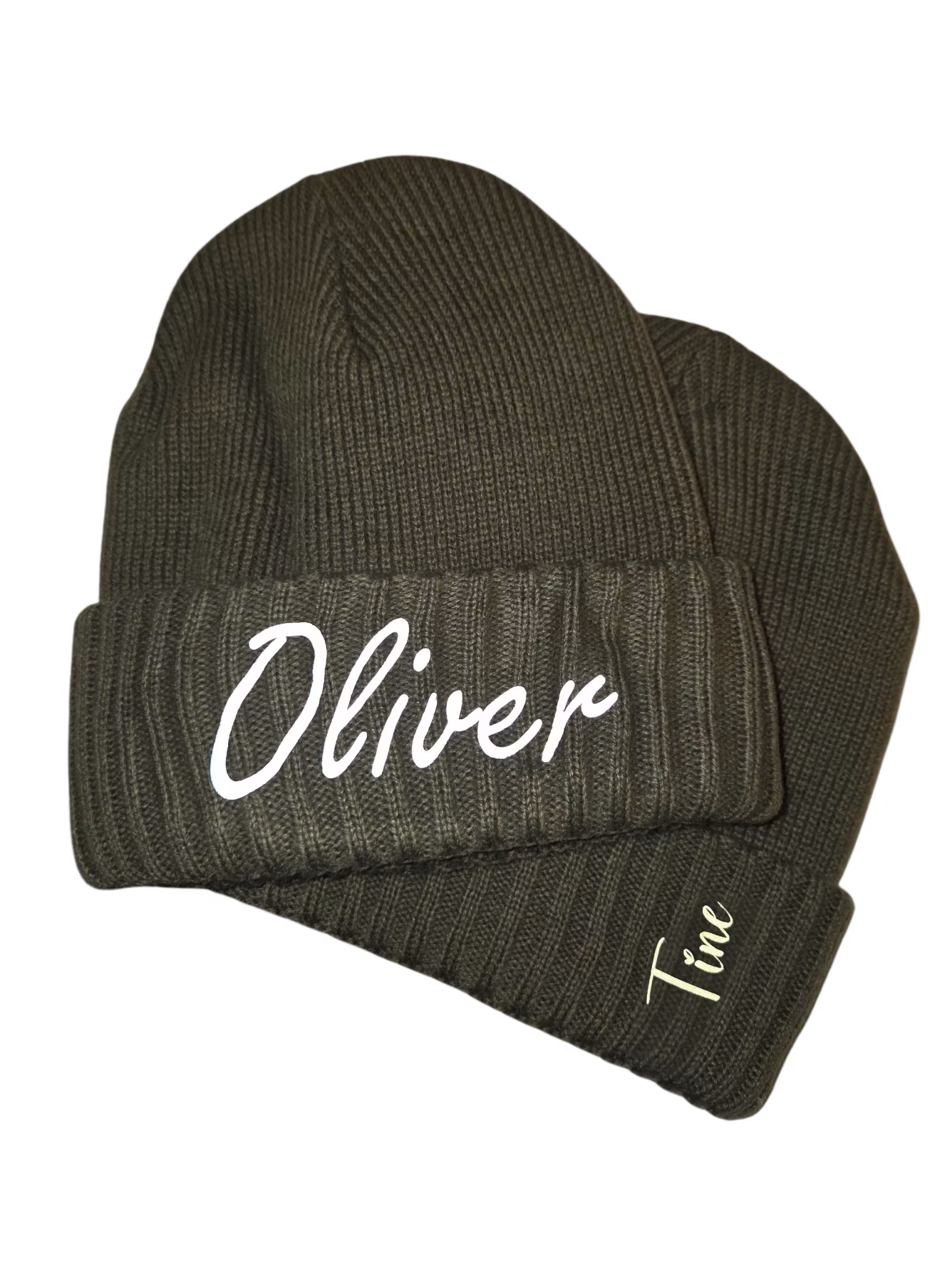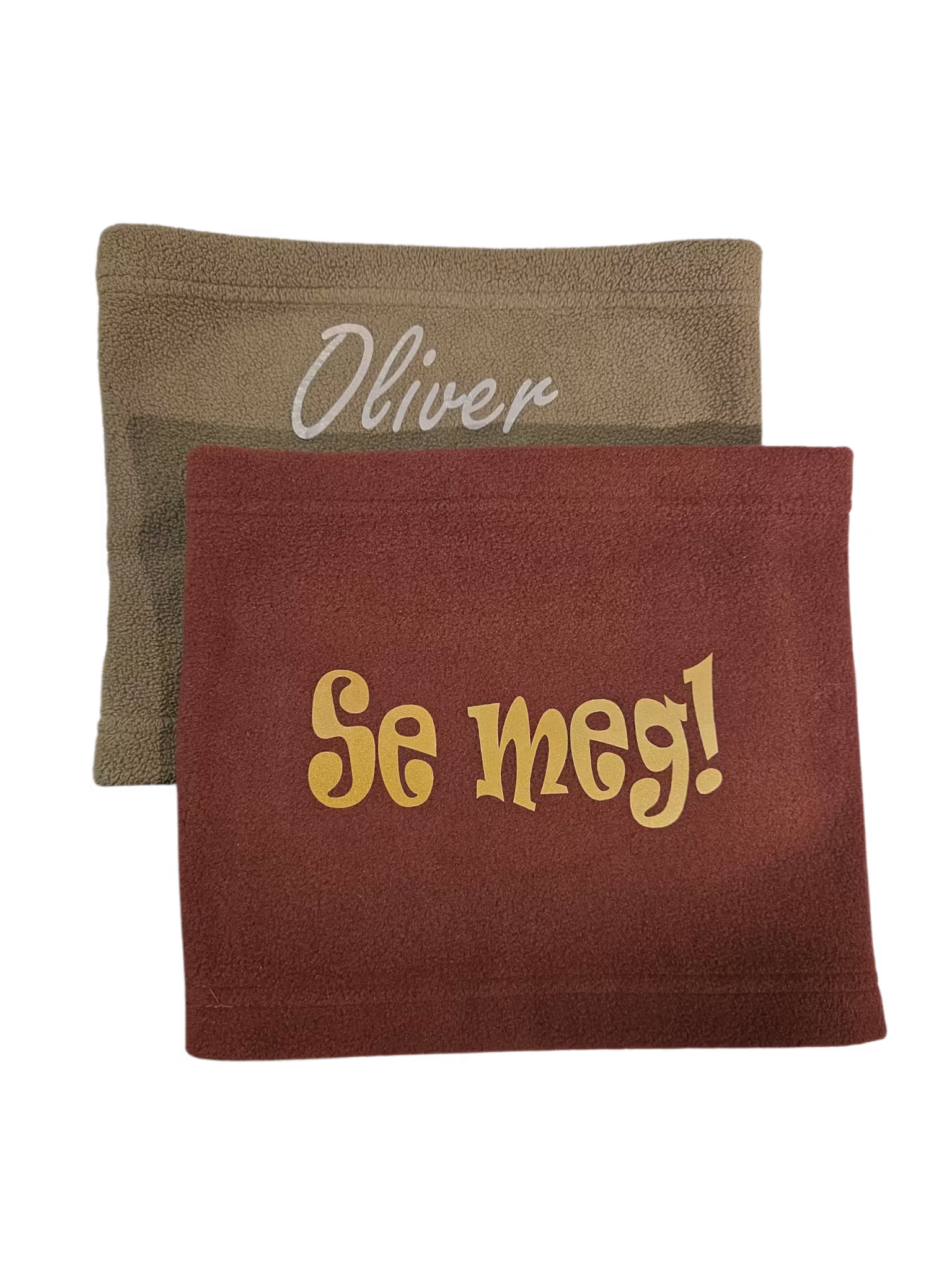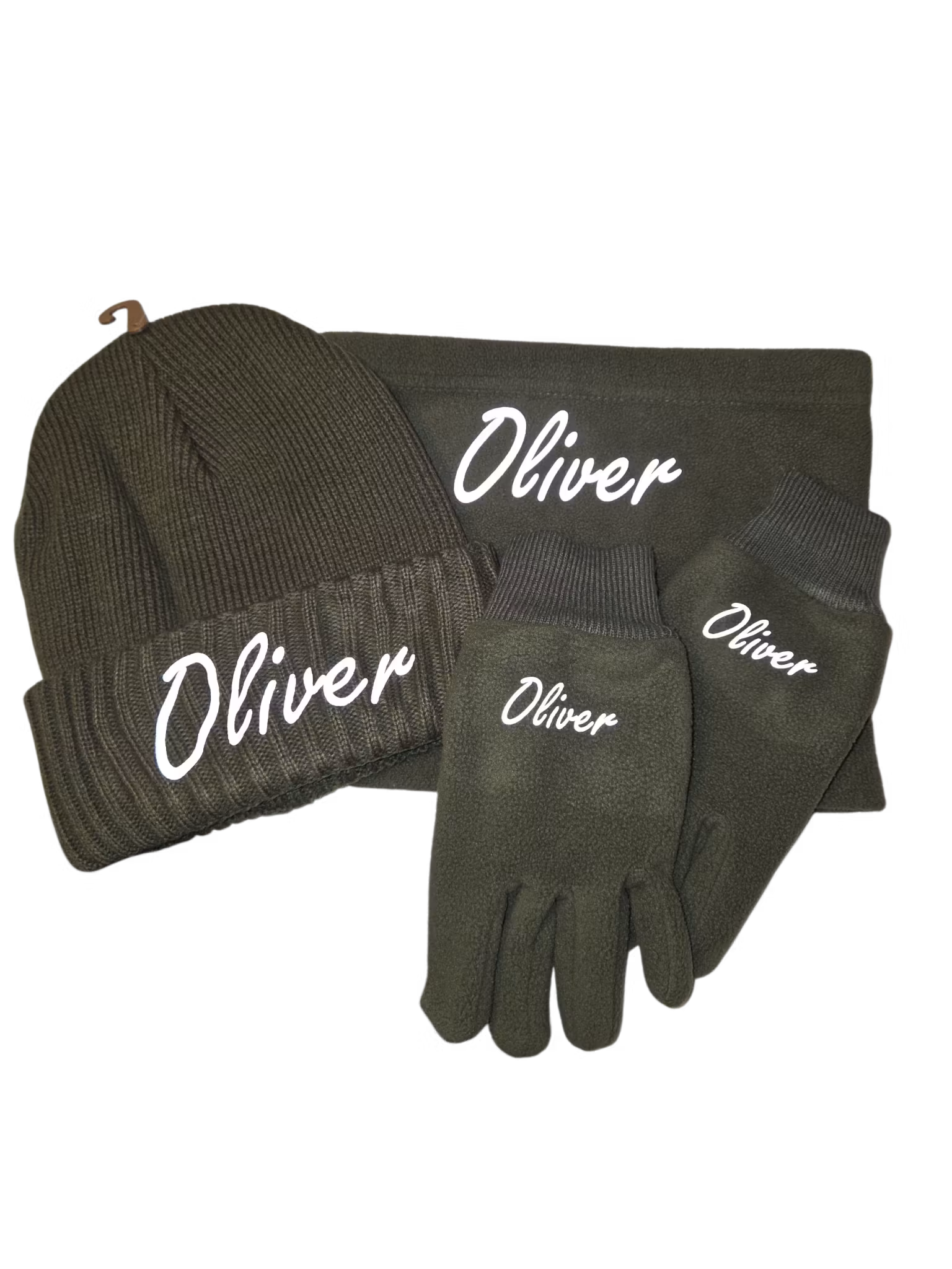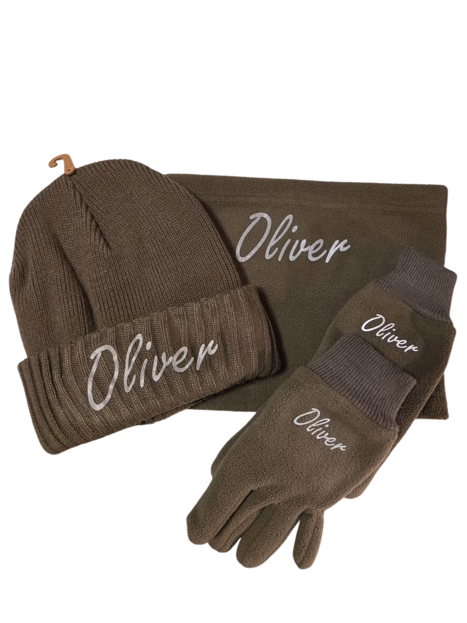 Lue, hals og vanter, med valgfritt navnetrykk med sølv eller gull refleksfarge.