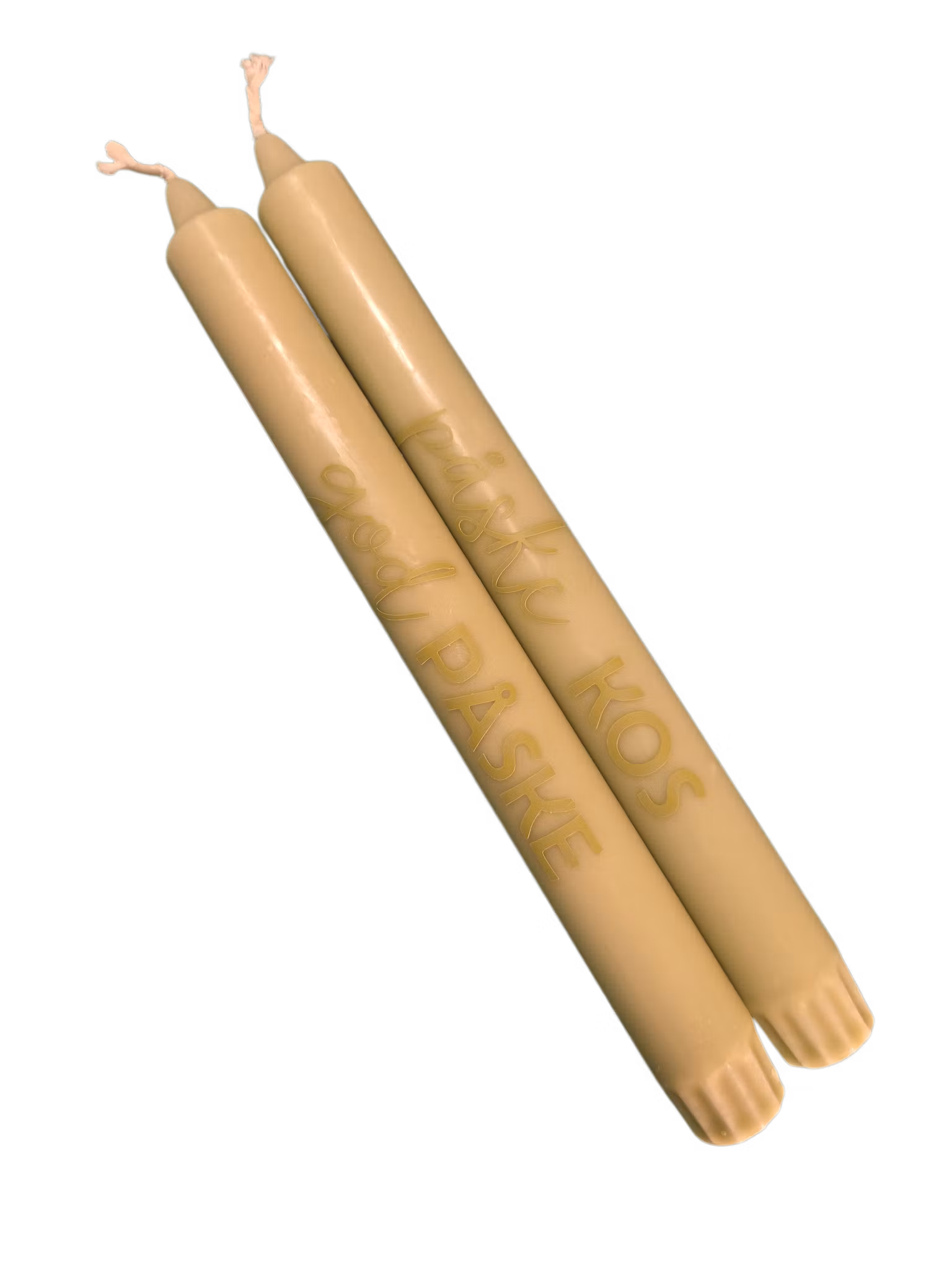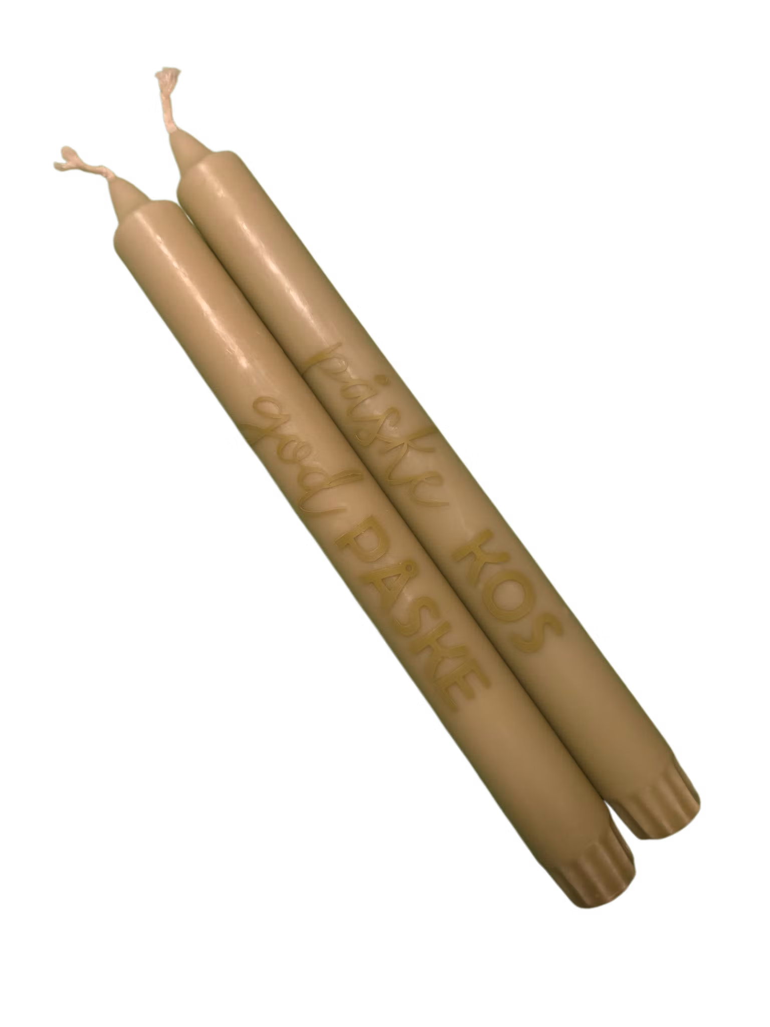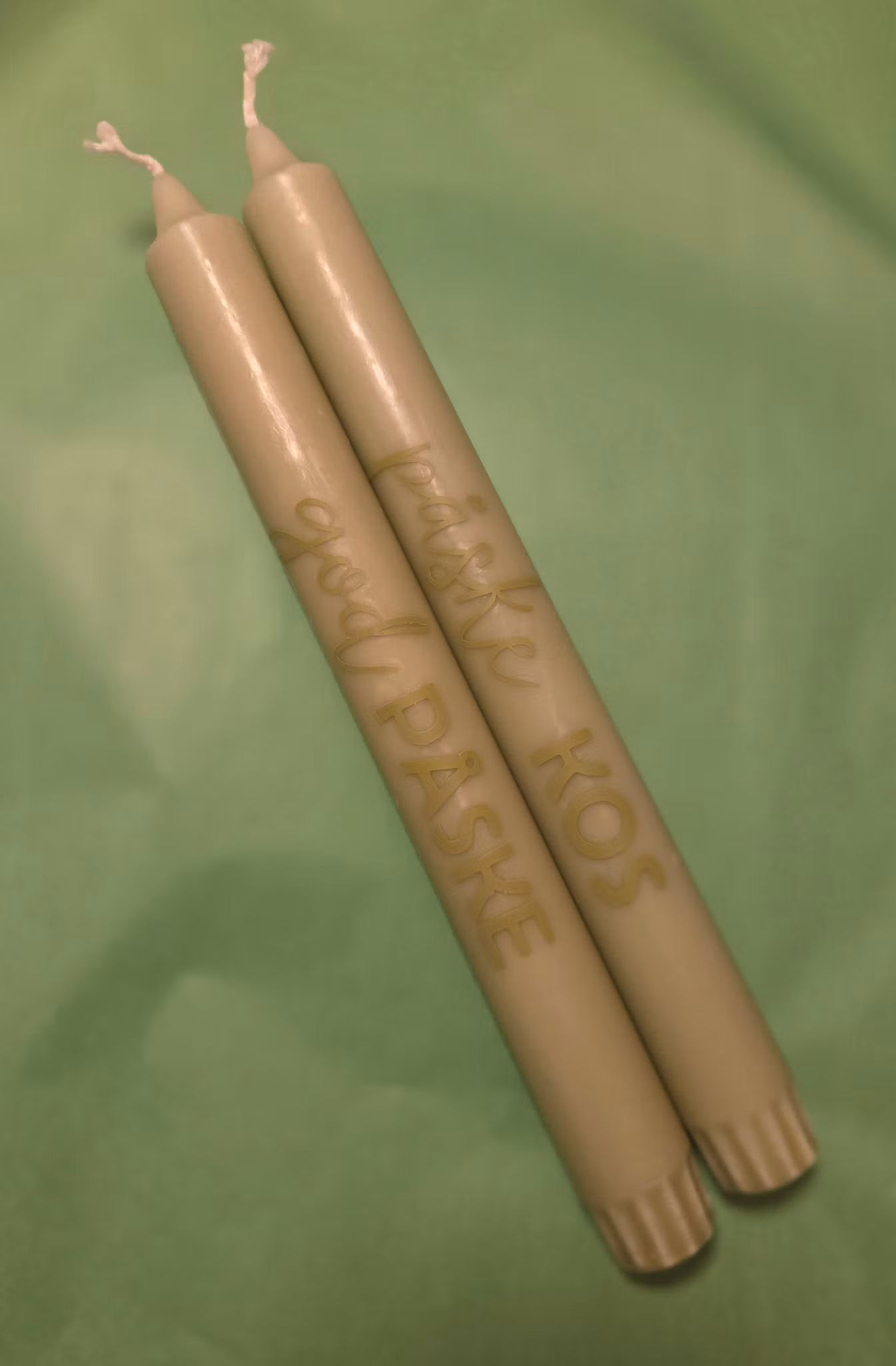 Grønne påskelys med teksten "påske KOS" og "god PÅSKE".