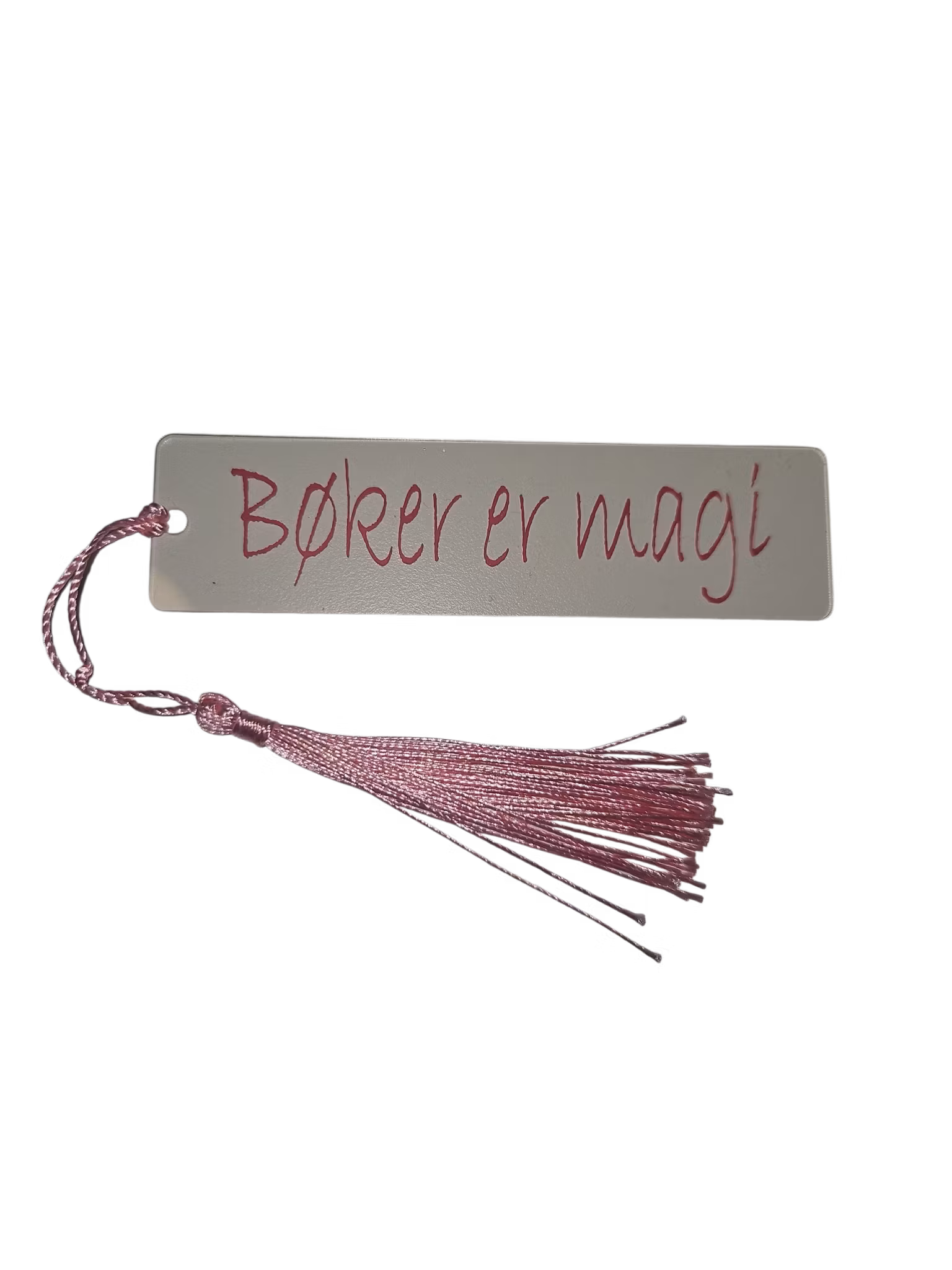 Bokmerke med teksten "Bøker er magi", rosa skrift og lys rosa trå.