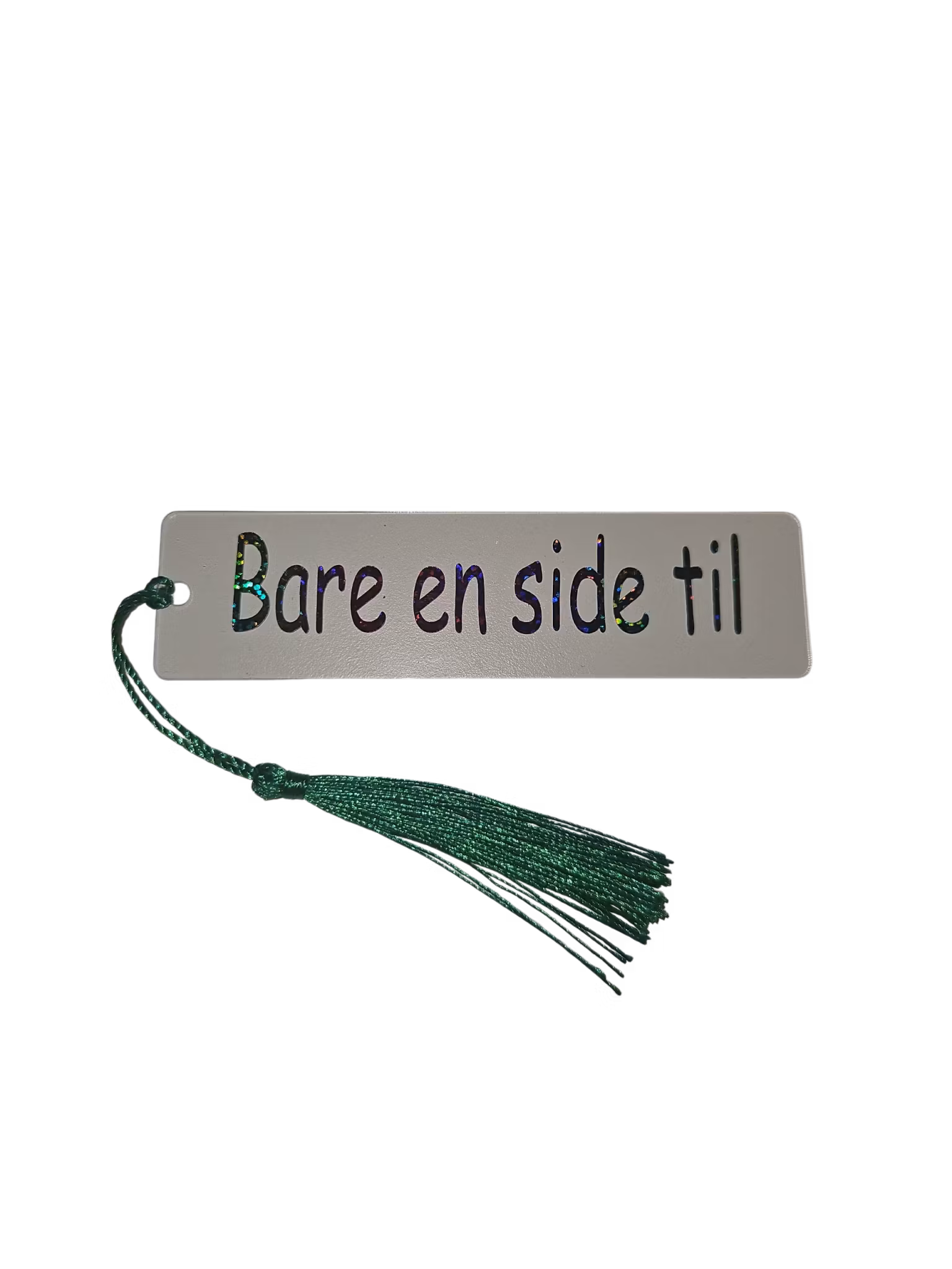 Bokmerke med teksten "Bare en side til", regnbue skrift og grønn trå.
