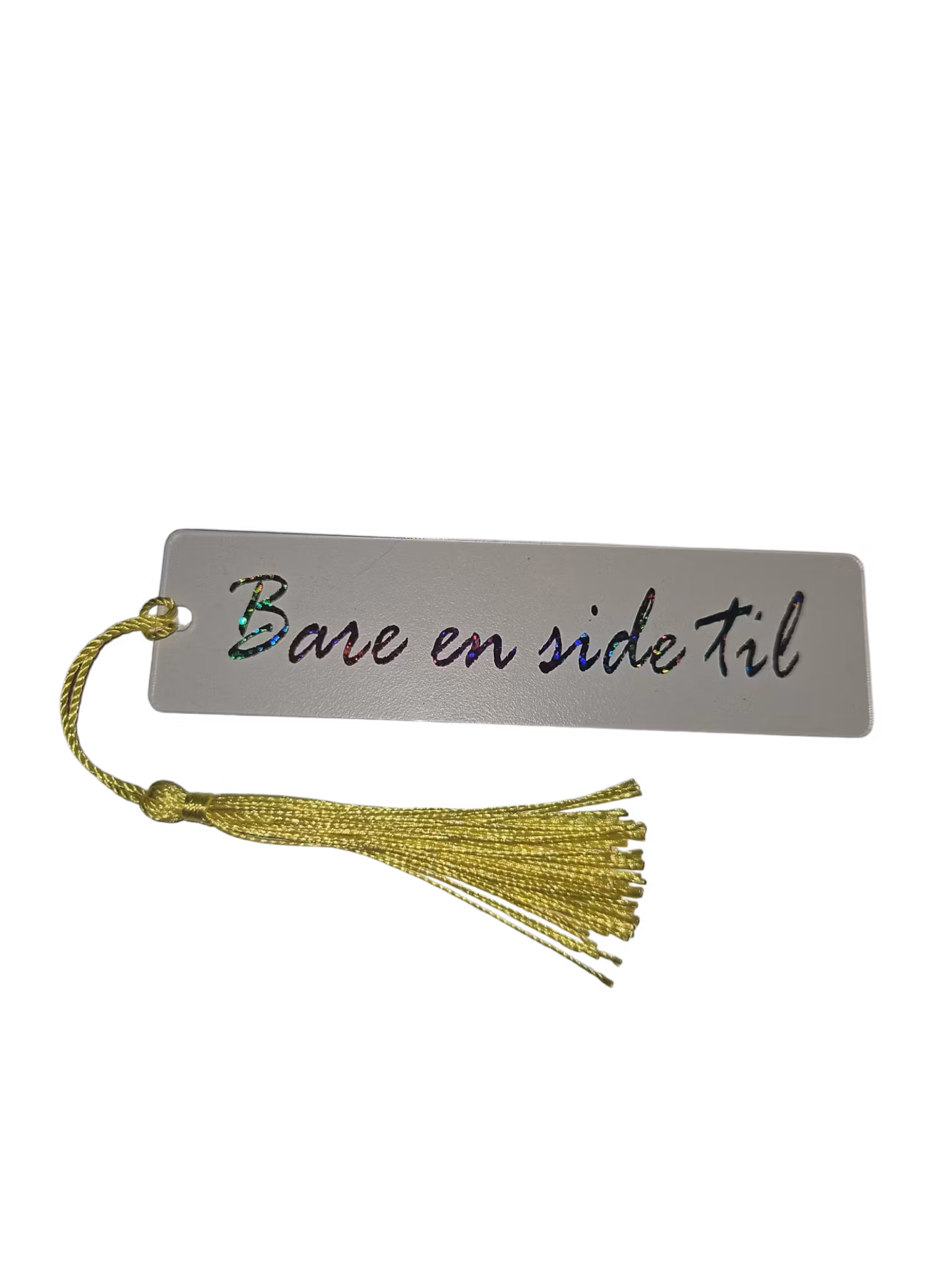Bokmerke med teksten "Bare en side til", regnbue skrift og gul trå.