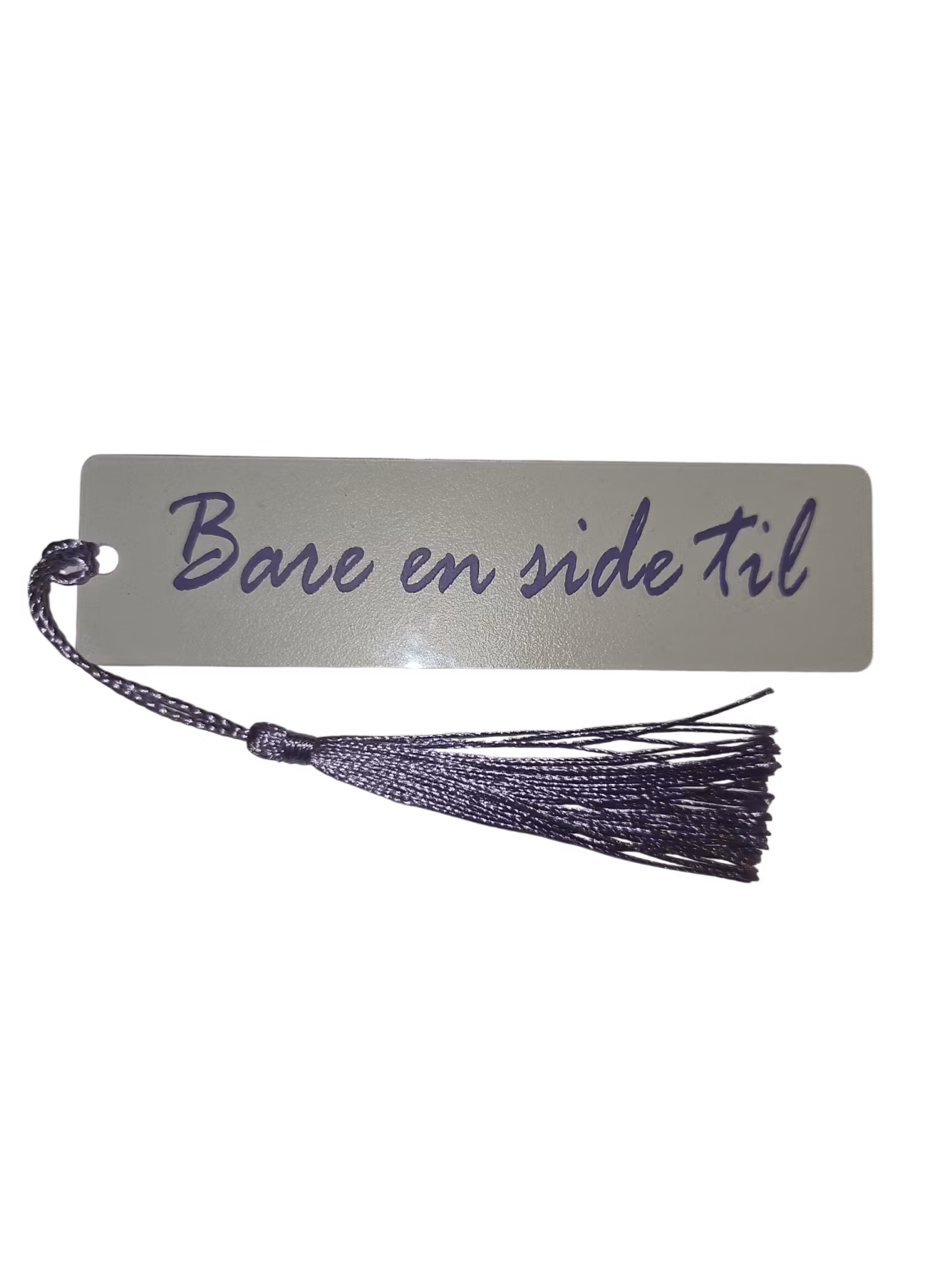 Bokmerke med teksten "Bare en side til", lilla skrift og lilla trå.