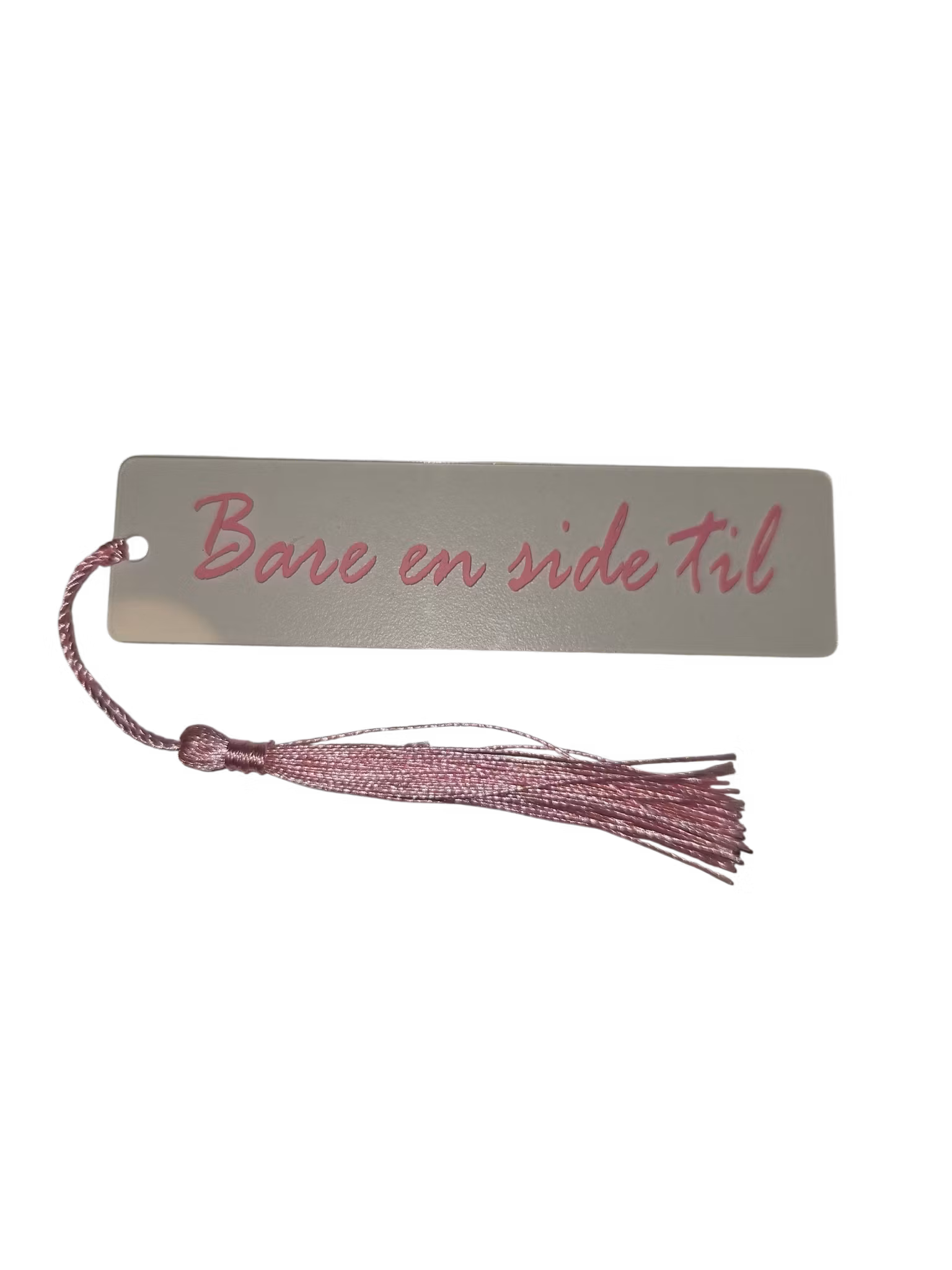 Bokmerke med teksten "Bare en side til", lys rosa skrift og lys rosa trå.