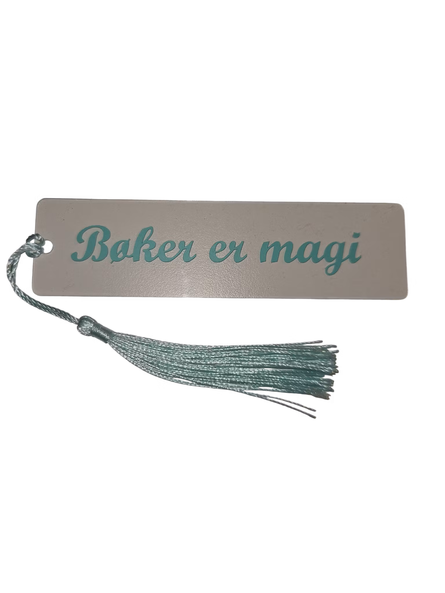 Bokmerke med teksten "Bøker er magi", mint skrift og mint trå.