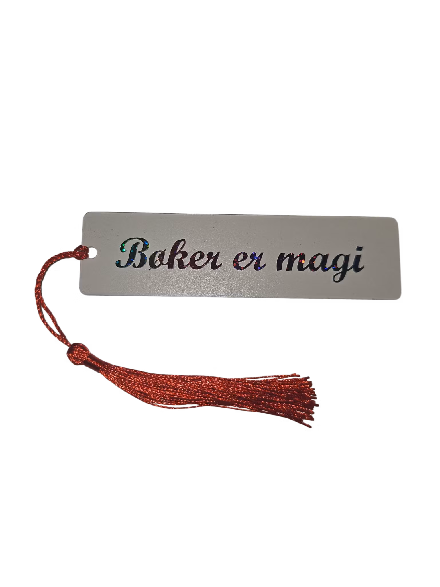 Bokmerke med teksten "Bøker er magi", regnbue skrift og rød trå.