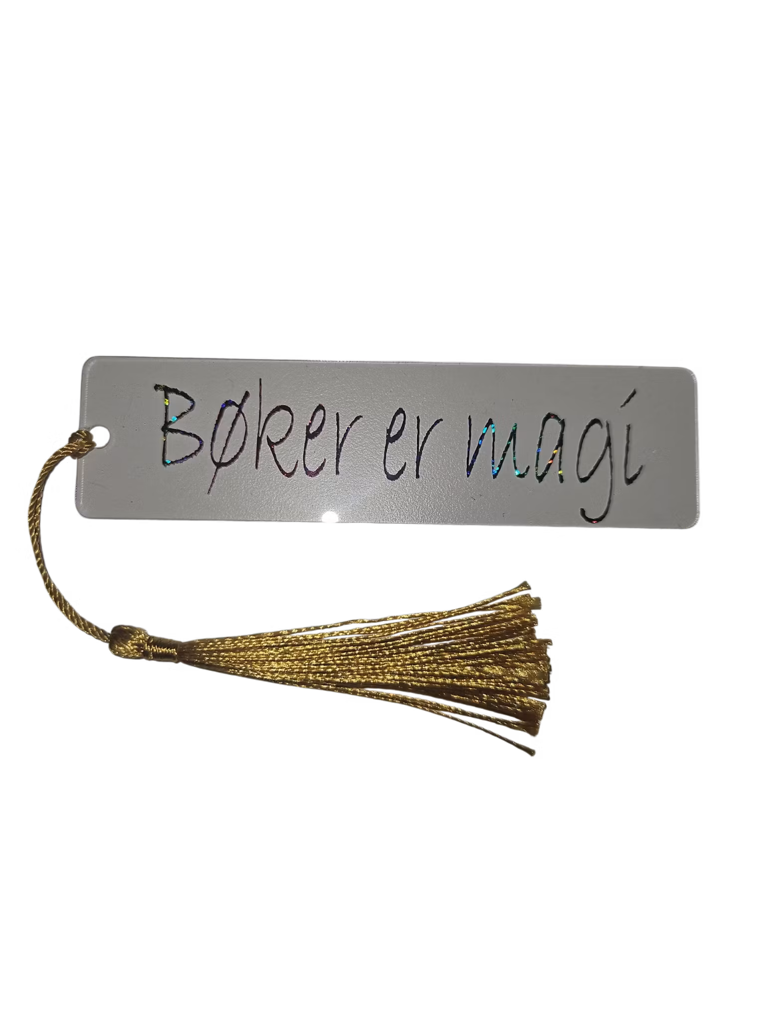 Bokmerke med teksten "Bøker er magi", regnbue skrift og gul trå.