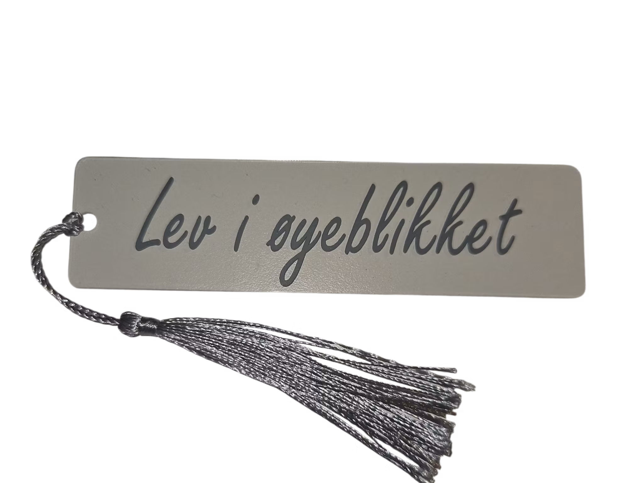 Bokmerke med teksten "Lev i øyeblikket", grå skrift og grå trå.