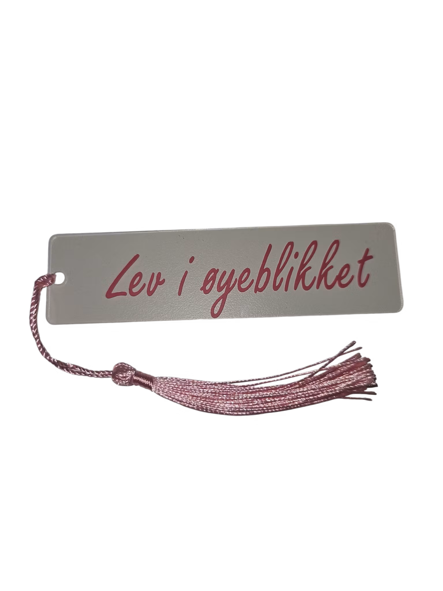 Bokmerke med teksten "Lev i øyeblikket", rosa skrift og lys rosa trå.