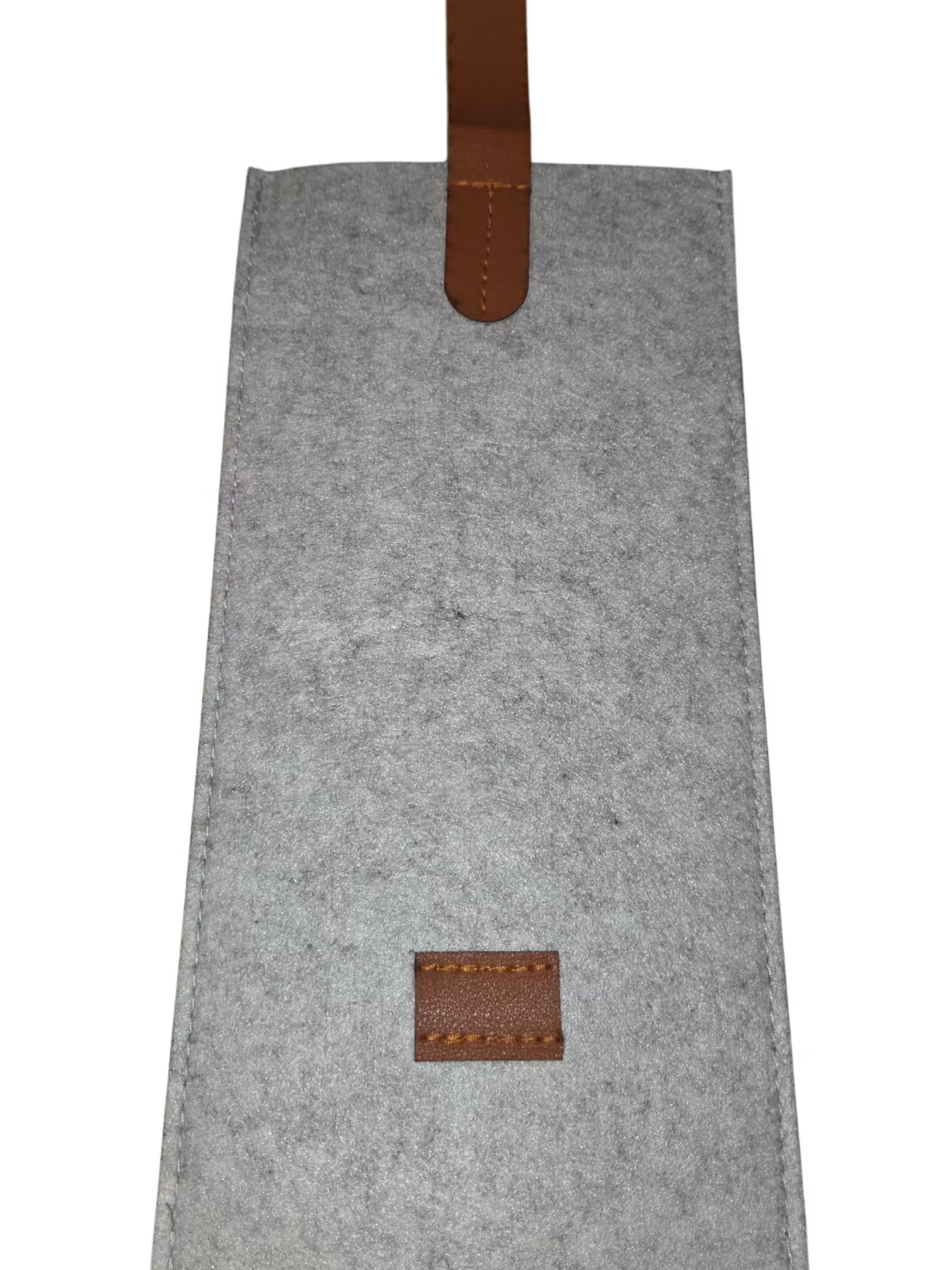 Grå flaskepose med valgfritekst. Teksten vil bli trykket i hvitt.