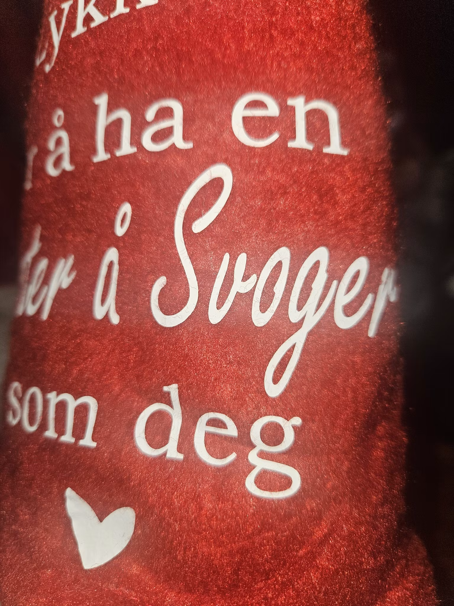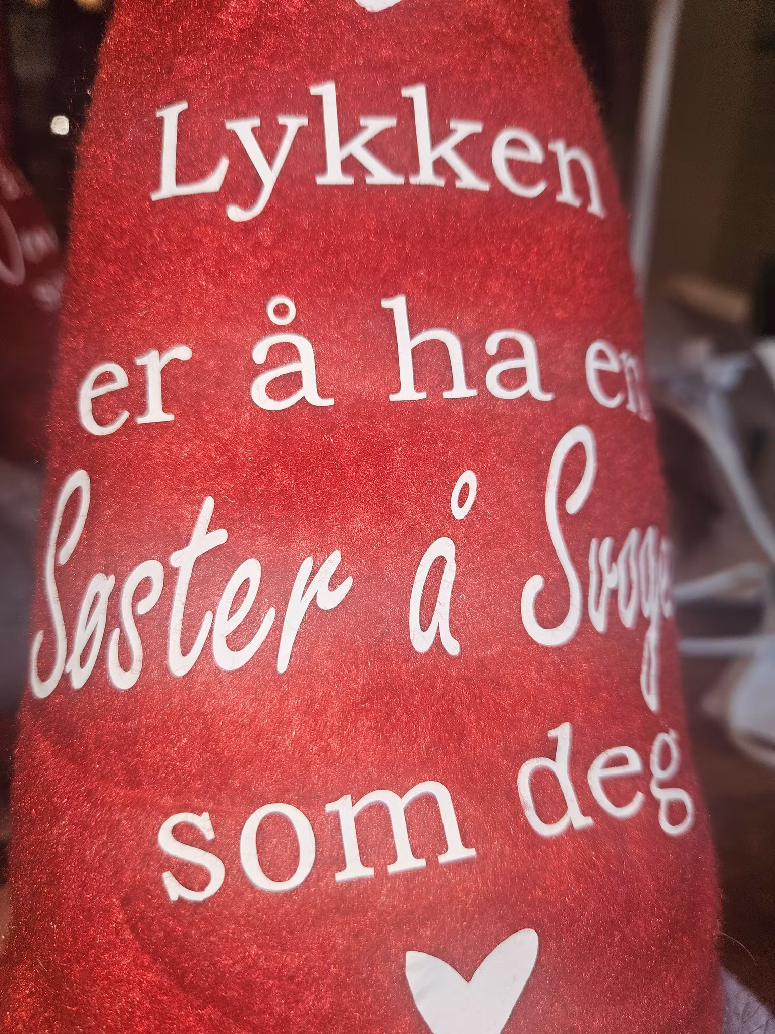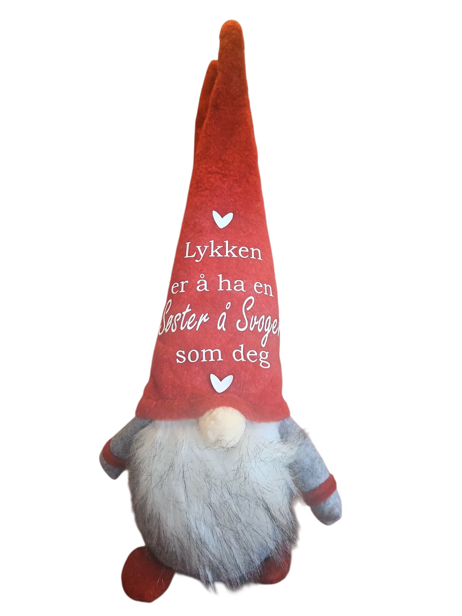 B-vare Nisse, "Lykken er å ha en Søster å Svoger som deg" Nissen er blitt brukt for å ta bilder, ingen feil eller mangler. Dette selges til redusert pris 69 kr, fullpris 169 kr.