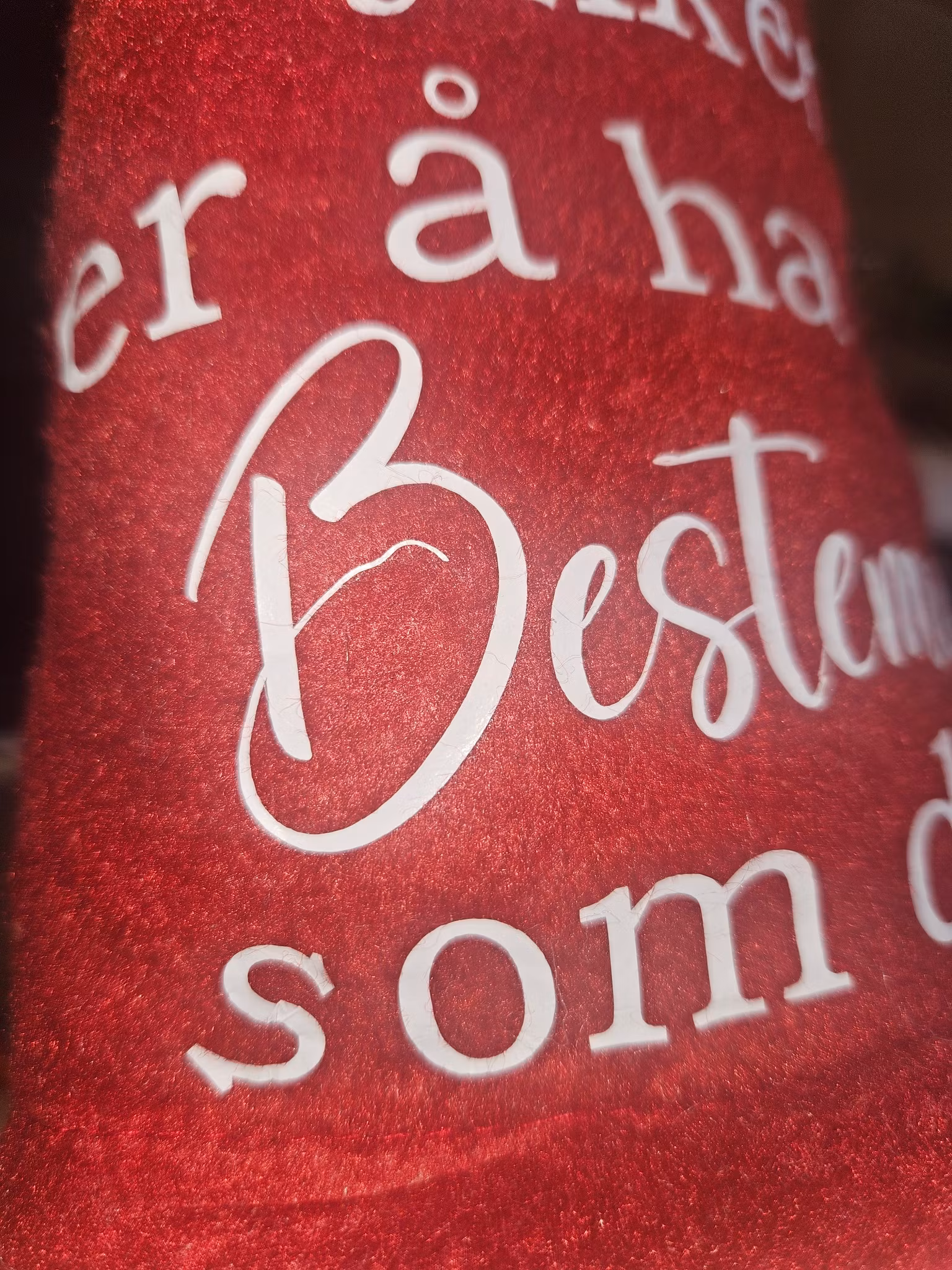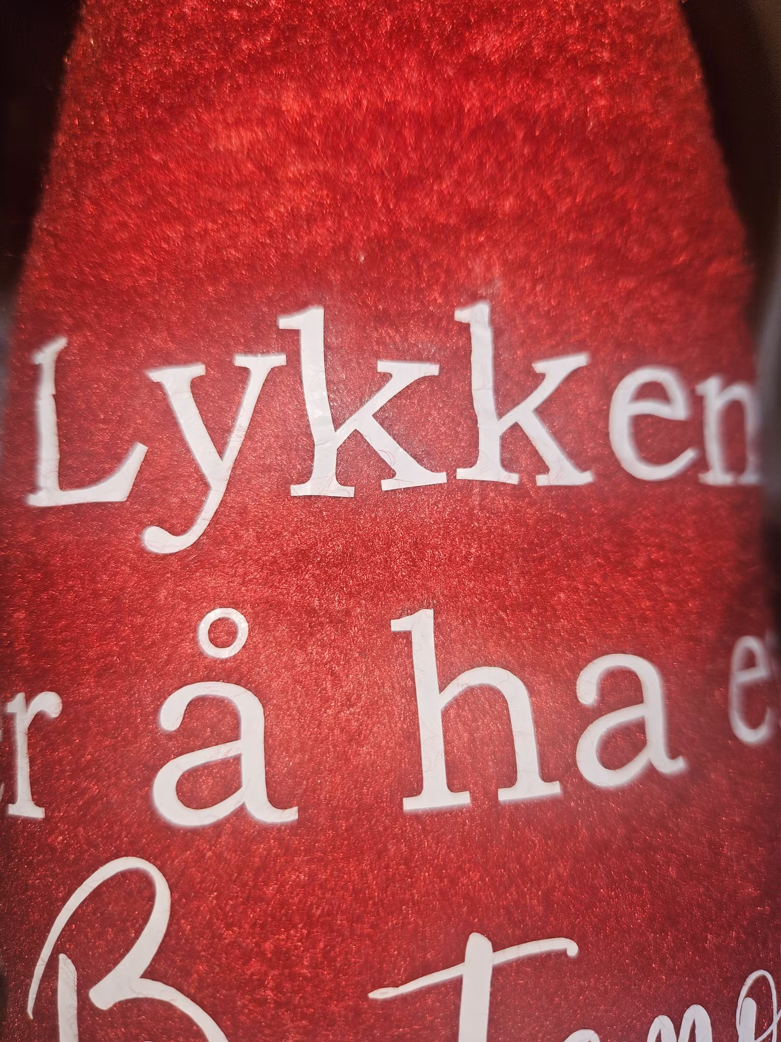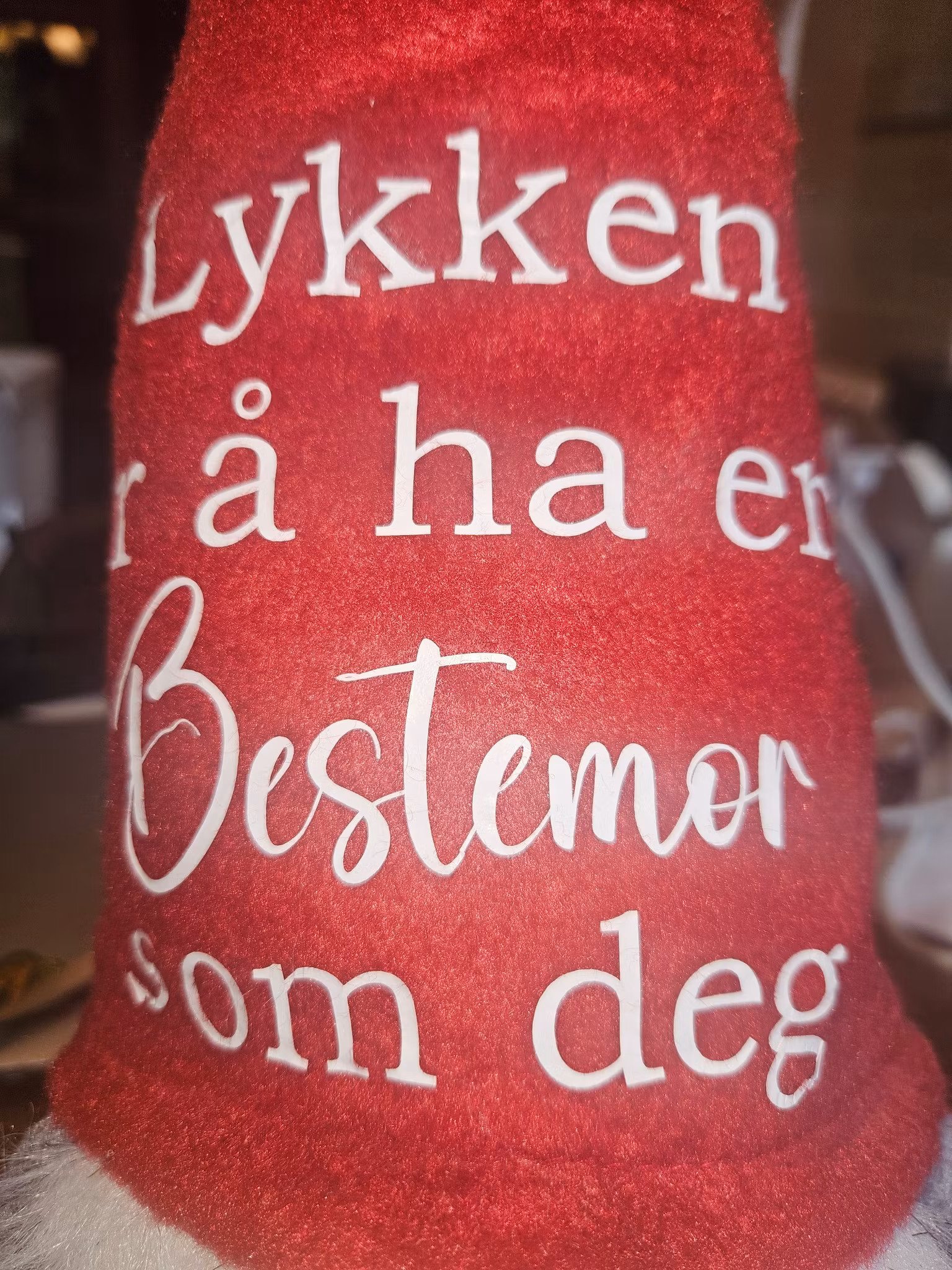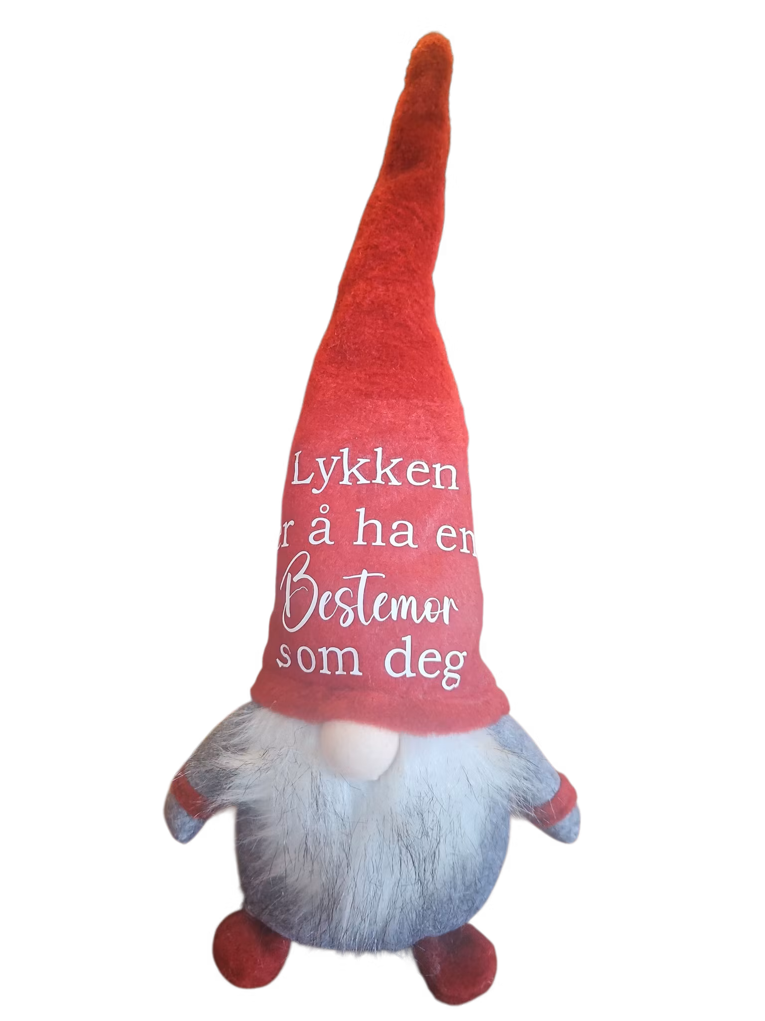 B-vare Nisse, "Lykken er å ha en Bestemor som deg" Nissen er litt skjev i trykket, se bildene. Denne selges til redusert pris 79 kr, fullpris 169 kr.