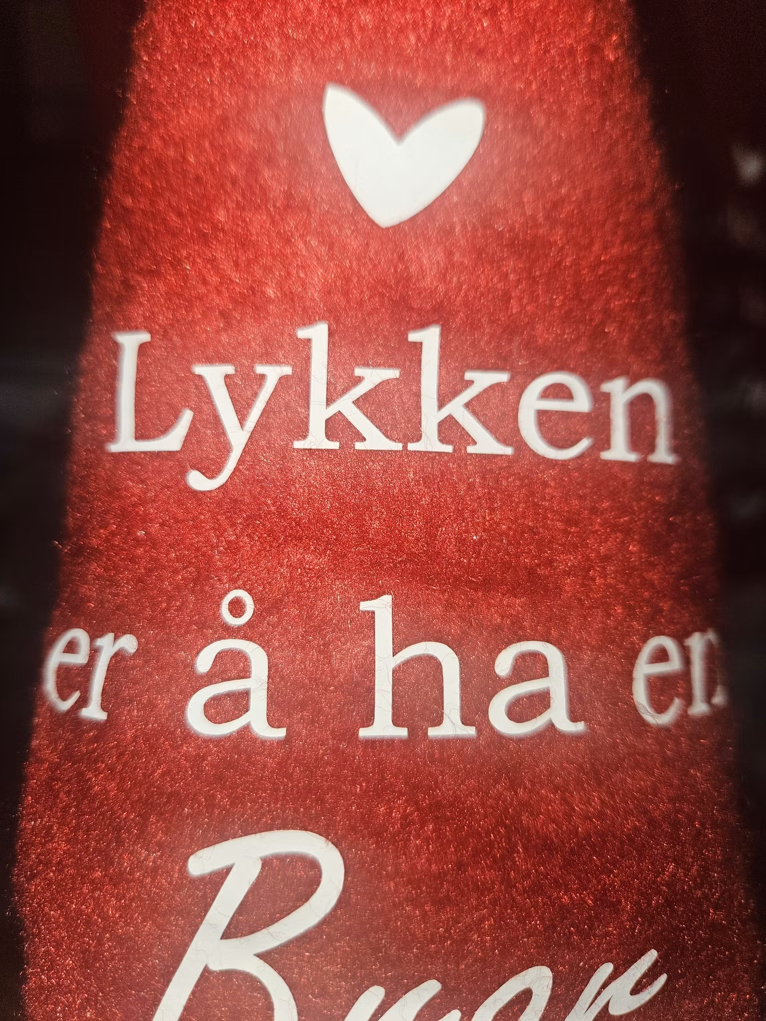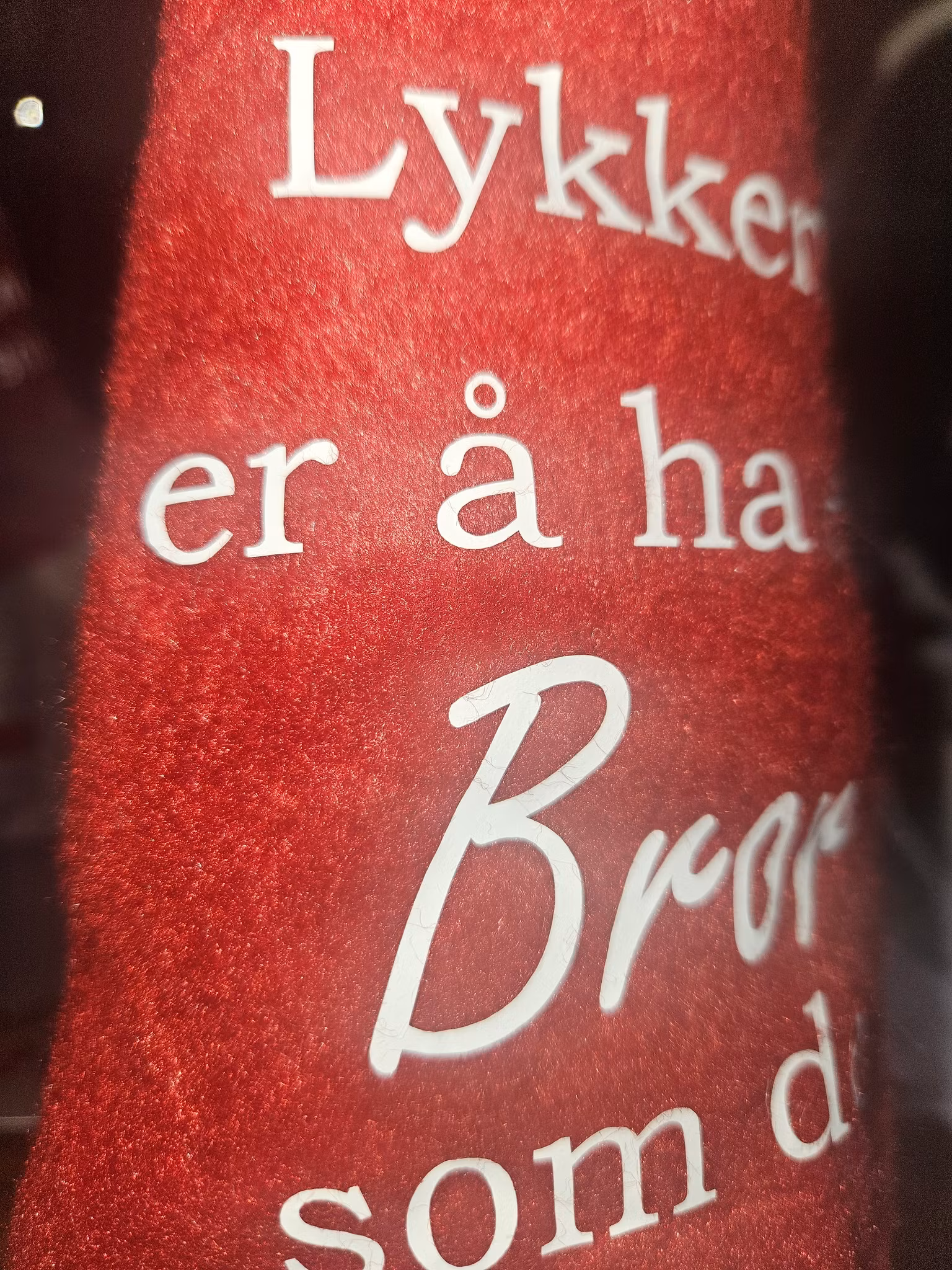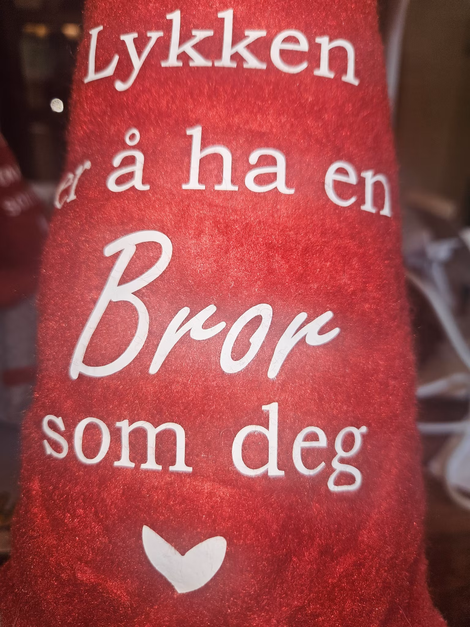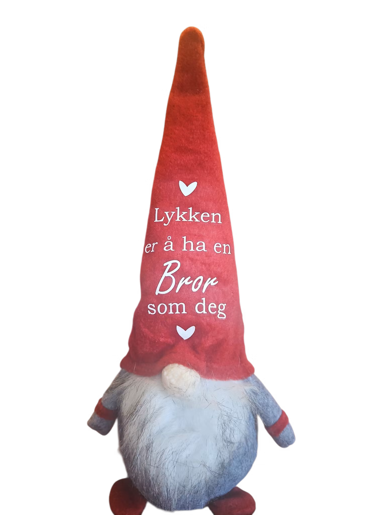 B-vare Nisse, "Lykken er å ha en Bror som deg" Nissen er blitt brukt for å ta bilder, ingen feil eller mangler. Denne selges til redusert pris 109 kr, fullpris 169 kr.