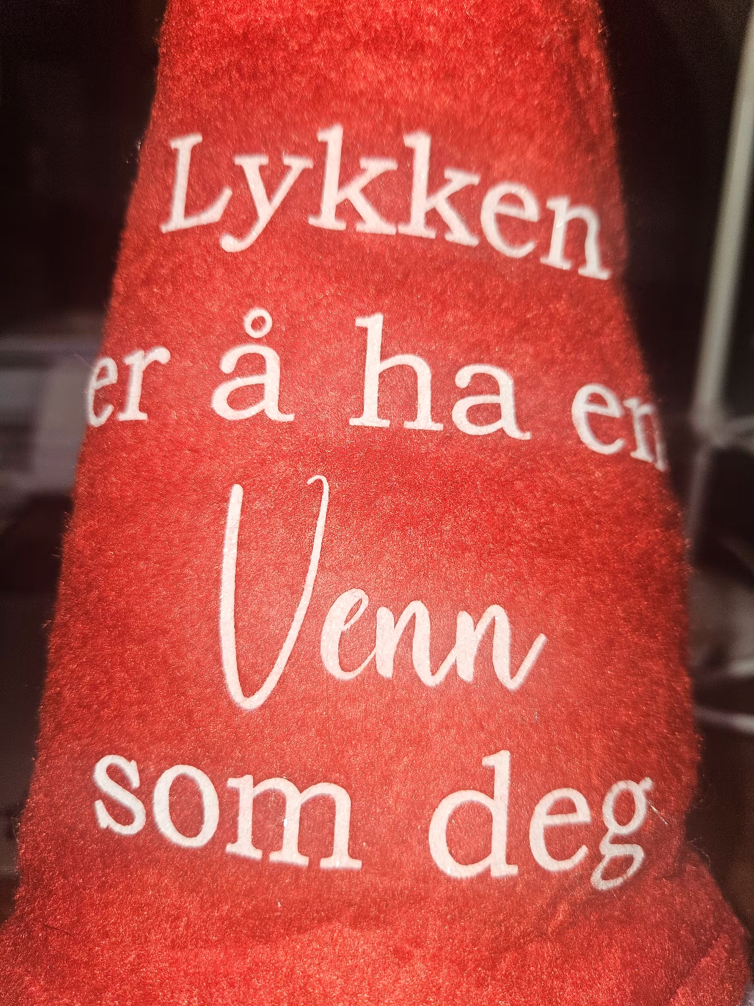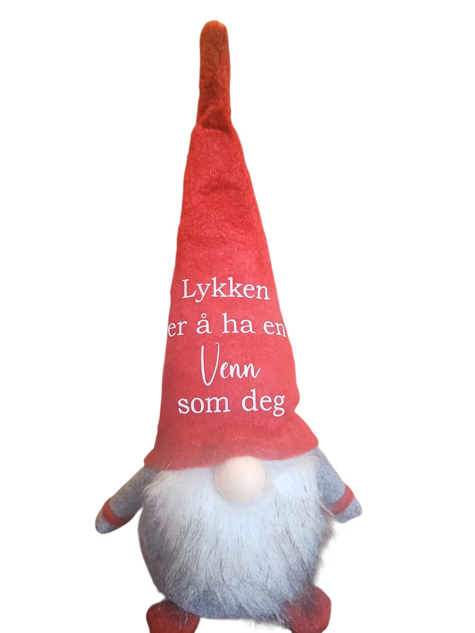 B-vare Nisse, "Lykken er å ha en Venn som deg" Nissen er litt skjev i trykket, ved "Lykken", se bildene. Denne selges til redusert pris 99 kr, fullpris 169 kr.