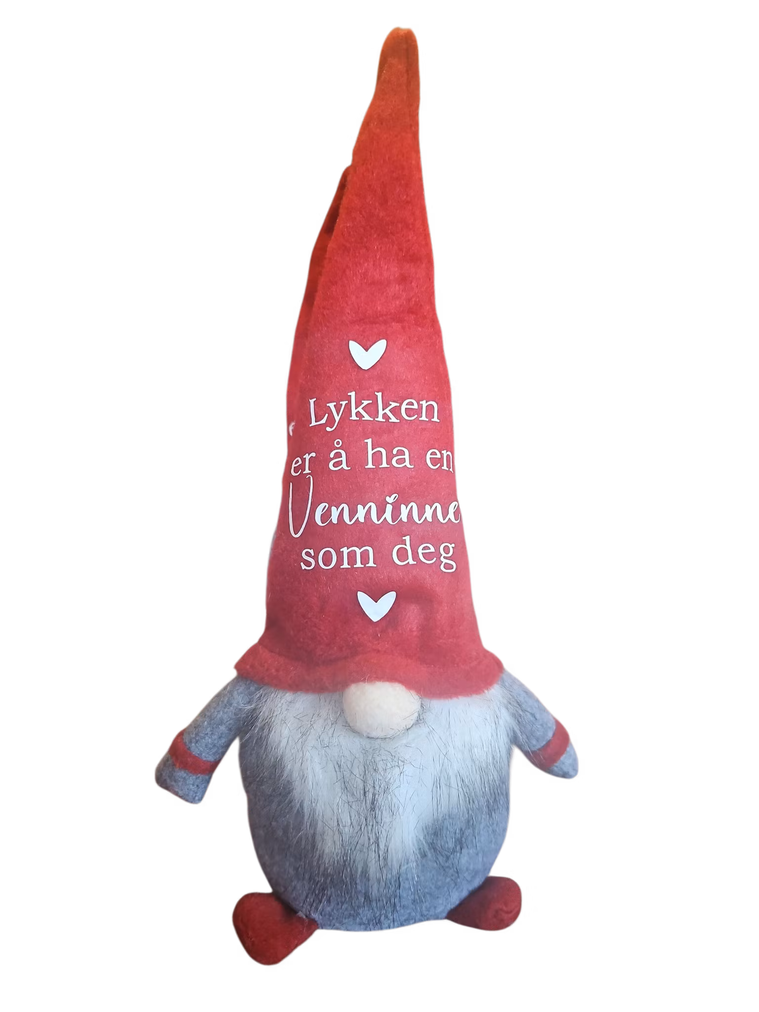 B-vare Nisse, "Lykken er å ha en Venninne som deg" Nissen er litt skjev i trykket, ved "Lykken", se bildene. Dette selges til redusert pris 89 kr, fullpris 169 kr.